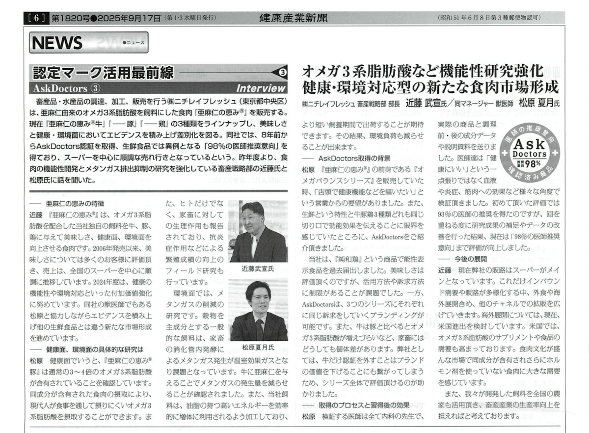 畜産品・水産品の調達、加工、販売を行う(株)ニチレイフレッシュ(東京都中央区)は、亜麻仁由来のオメガ3系脂肪酸を飼料にした食肉「亜麻仁の恵みⓇ」を販売する。現在「亜麻仁の恵みⓇ牛」は、「一豚」「一鶏」の3種類をラインナップし、美味しさと健康・環境面においてエビデンスを積み上げ差別化を図る。同社では、8年前からAskDoctorsの認証を取得、生鮮食品では異例となる「98%の医師推奨意向」を得ており、スーパーを中心に順調な売れ行きとなっているという。昨年度より、食肉の機能性開発とメタンガス排出抑制の研究を強化している畜産戦略部の近藤氏と松原氏に話を聞いた。